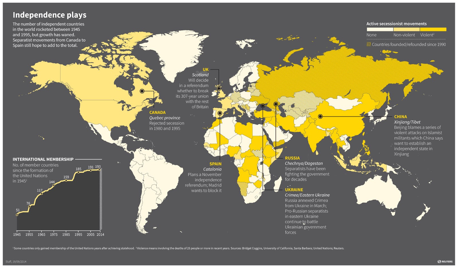 After weeks of high-voltage campaign from the Yes and No camps, Scotland has voted to remain part of the United Kingdom. But Scotland is not the only place where secessionist tendencies have taken root. Reuters blog has a terrific infographic on major separatist movements around the world.